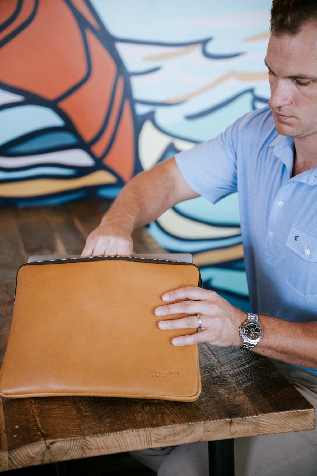 Brown Laptop Sleeve The Clifford laptop sleeve in Korchmar's Classic Leather is made of American cowhide leather that is selected from the top 5% of available hides. Colored only with aniline dyes, this leather retains its natural beauty over time and features visible markings that are characteristic of only the finest leather. #color_brown