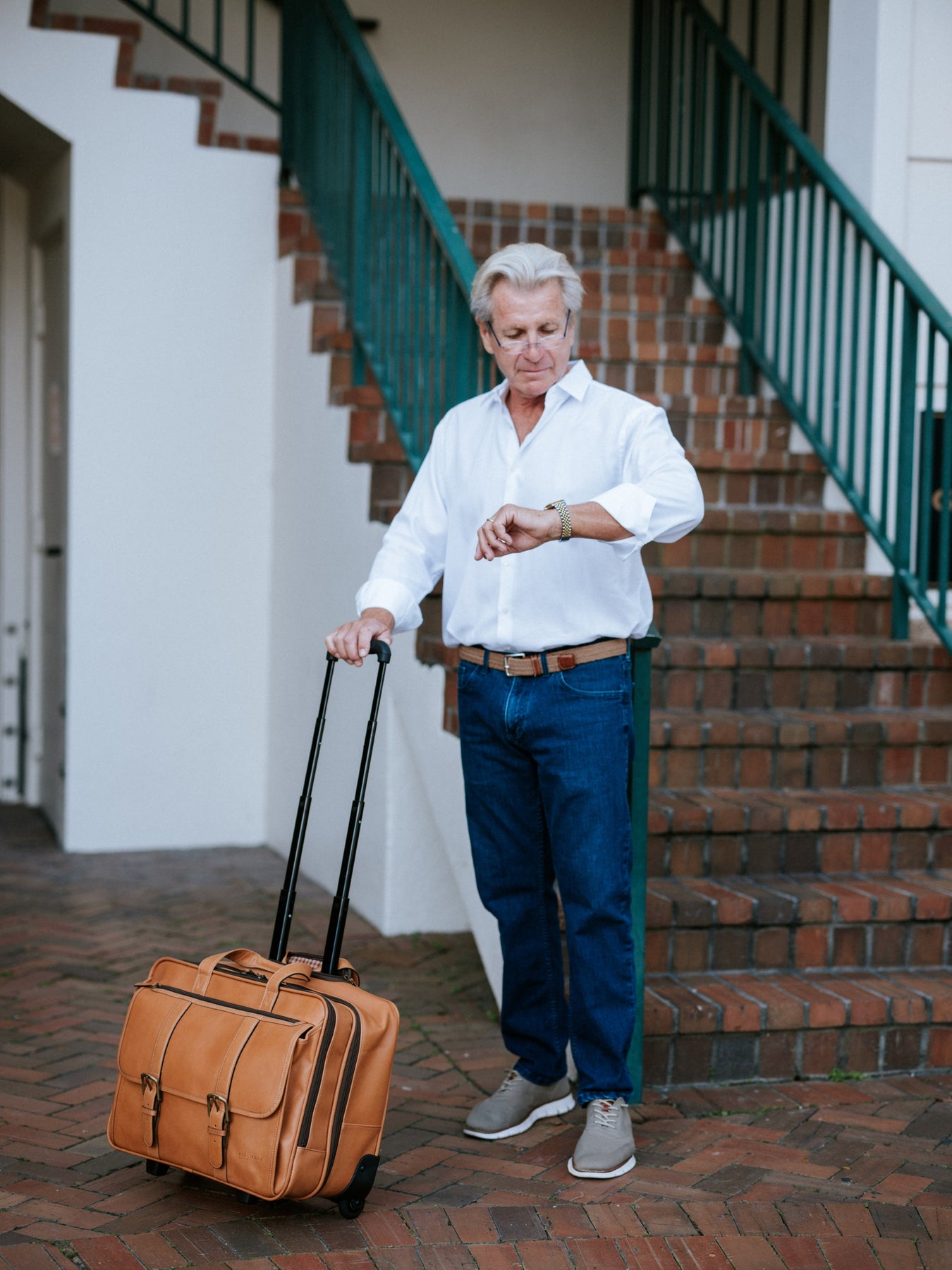 Tan Wheeled Leather Travel Briefcase The Kenton full grain leather rolling laptop bag also functions as a convenient overnight bag. It features a generous compartment for a change of clothes, as well as plenty of room for files, and padded pocket designed to safely accommodate most 15" laptops.